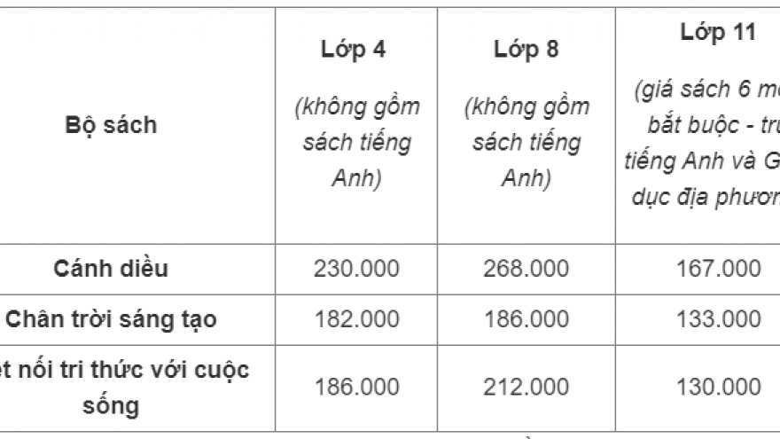 VOV.VN - Một bộ sách giáo khoa lớp 4, 8, 11 chương trình phổ thông mới áp dụng từ năm học 2023 - 2024 có giá cao nhất 268.000 đồng, tăng khoảng 2-3 lần so với bộ hiện hành.