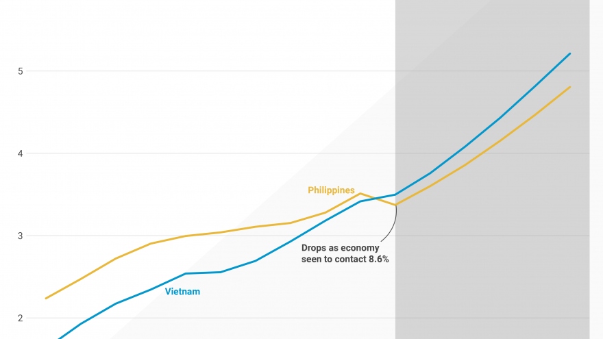 VOV.VN - Báo cáo mới đây của Quỹ Tiền tệ Quốc tế (IMF) cho thấy, trong vòng 5 năm nữa, Tổng sản phẩm quốc nội (GDP) bình quân đầu người của Philippines khó có thể đuổi kịp Việt Nam.