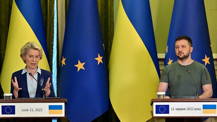 VOV.VN - Chủ tịch Ủy ban châu Âu (EC) Ursula von der Leyen hôm 17/6 cho biết, Liên minh châu Âu (EU) vừa khuyến nghị trao cho Ukraine tư cách ứng viên thành viên EU.