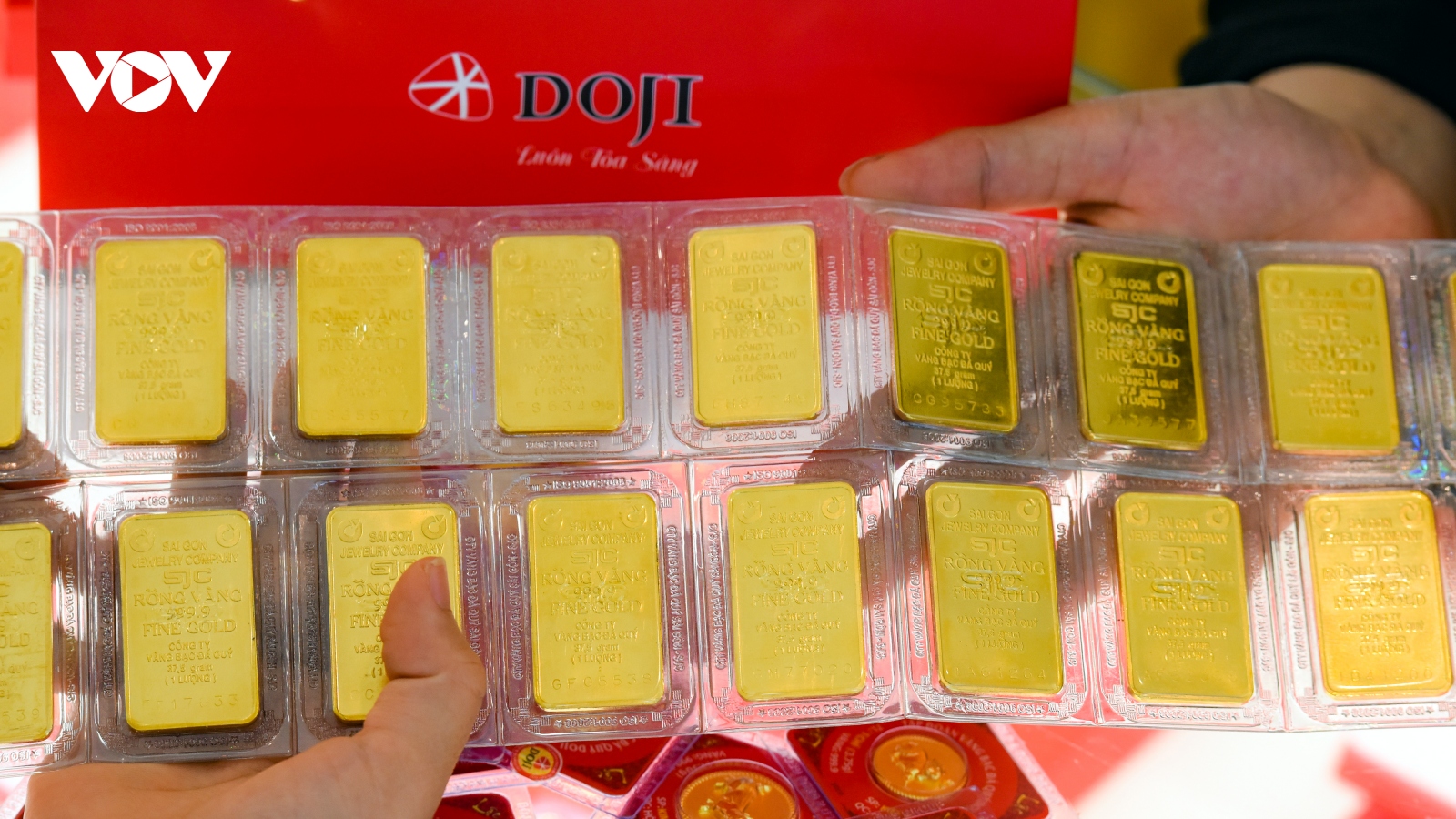 VOV.VN - Sau một vài phiên điều chỉnh tăng giá vàng trong nước và thế giới cùng giảm mạnh, hiện giá bán vàng SJC cao hơn 19,33 triệu đồng/lượng so với giá vàng thế giới.