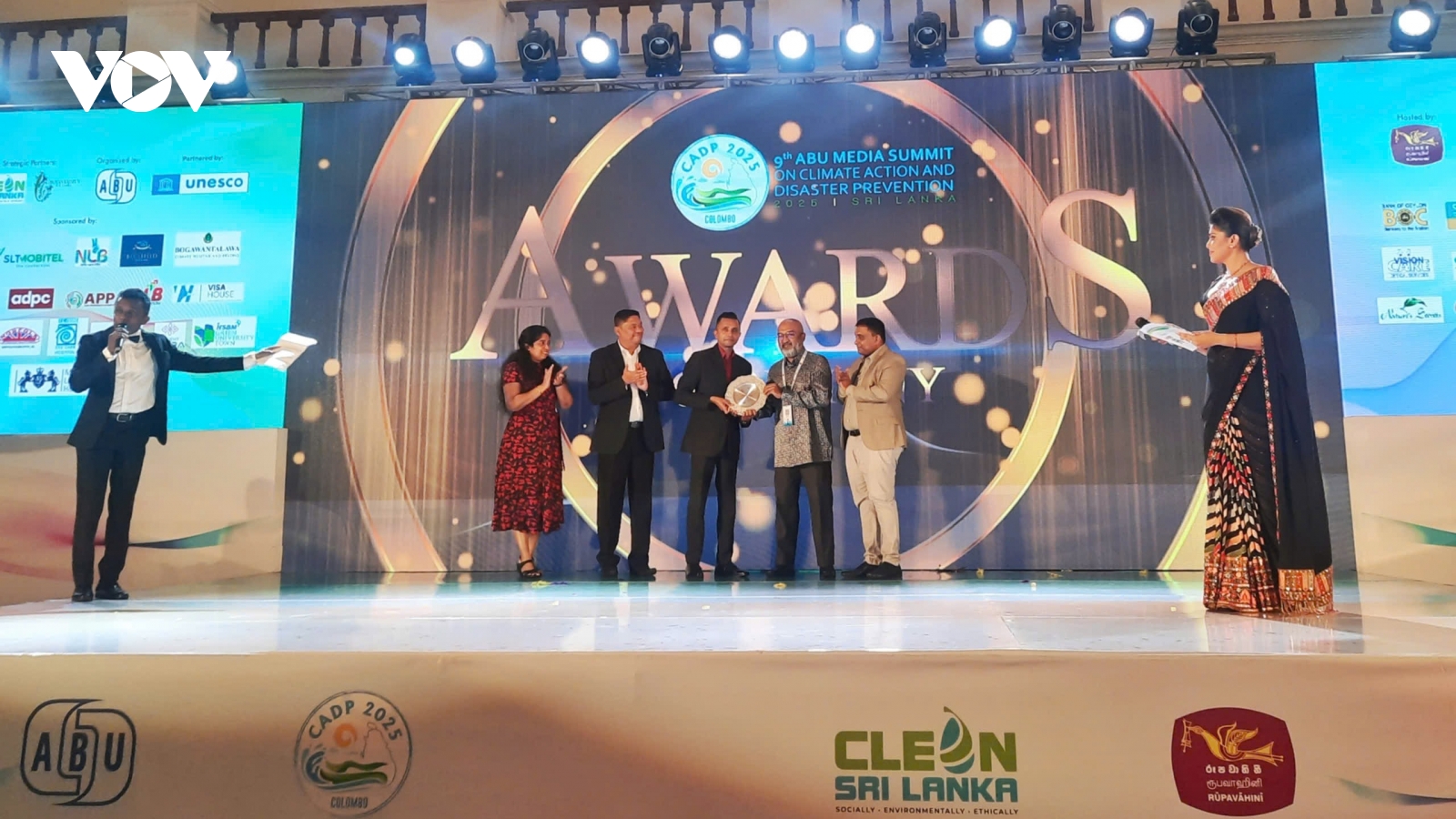 VOV.VN - Tối 26/11, tại Colombo (Sri Lanka) diễn ra lễ trao giải thưởng truyền thông ABU trong khuôn khổ Hội nghị truyền thông ABU lần thứ 9 về Hành động ứng phó với khí hậu và Phòng ngừa thiên tai.
