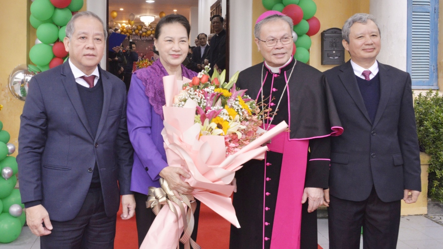 VOV.VN - Tiếp tục chuyến công tác các tỉnh miền Trung, sáng 22/12, Chủ tịch Quốc hội Nguyễn Thị Kim Ngân và Đoàn công tác của Quốc hội đã đến thăm và chúc mừng Toà Tổng Giám mục Tổng giáo phận Huế nhân dịp năm mới 2021 và Giáng sinh.