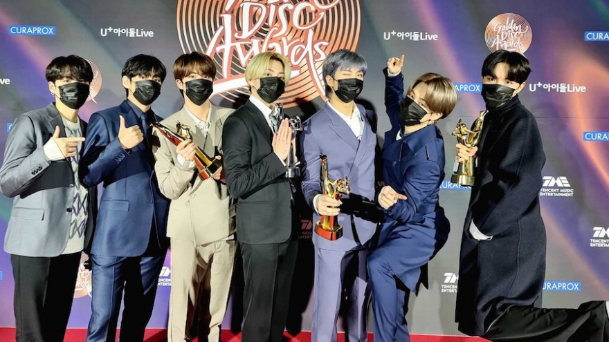 VOV.VN - Với giải Album của năm (Disc Daesang) vừa nhận được, BTS là nhóm nhạc nhận nhiều giải Deasang nhất, trong lịch sử giải thưởng được mệnh danh là "Grammy của Hàn Quốc".