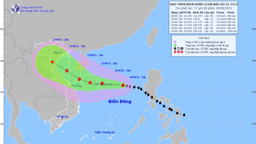 VOV.VN - Theo Trung tâm Dự báo Khí tượng Thủy văn Quốc gia, hồi 4 giờ ngày 9/9, vị trí tâm bão ở khoảng 15,7 độ Vĩ Bắc; 118,8 độ Kinh Đông, cách quần đảo Hoàng Sa khoảng 780km về phía Đông Đông Nam.
