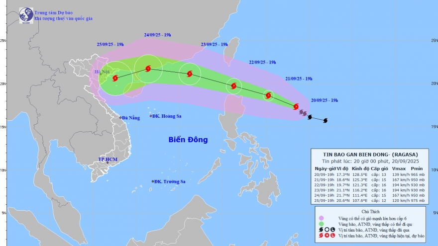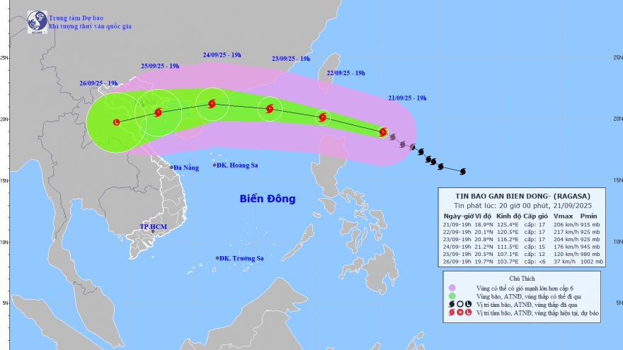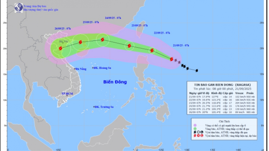 VOV.VN - Trung tâm Dự báo Khí tượng Thủy văn Quốc gia cho biết, tối 22/9, siêu bão Ragasa với sức gió mạnh cấp 17, giật trên cấp 17 đã áp sát đảo Luzon (Philippines) và đang tiến vào Biển Đông. Dự báo từ ngày 24/9, bão sẽ gây gió mạnh, sóng lớn và biển động dữ dội tại vịnh Bắc Bộ.