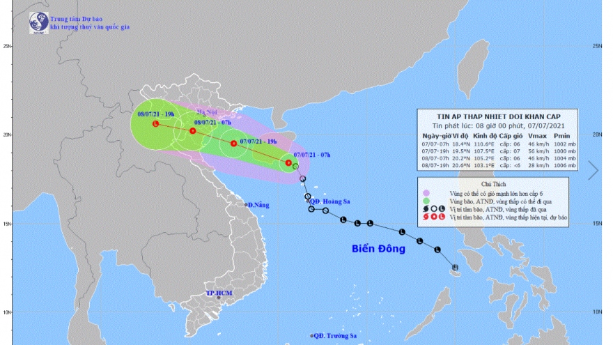 VOV.VN - Trong 12 giờ tới, áp thấp nhiệt đới di chuyển theo hướng Tây Tây Bắc, mỗi giờ đi được 25-30km, có khả năng mạnh thêm và đi vào Vịnh Bắc Bộ.