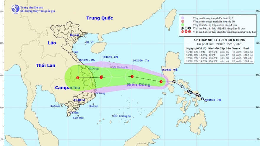 VOV.VN - Trên khu vực giữa biển Đông hình thành một vùng áp thấp, dự báo trong 24h tới, vùng áp thấp di chuyển theo hướng Tây, mỗi giờ đi được khoảng 5-10km.