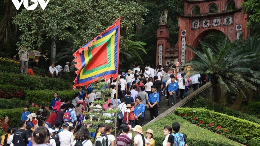 VOV.VN - Ngày 9/4, Khu Di tích lịch sử Đền Hùng thu hút rất đông du khách đến dâng hương, chiêm bái. Đường lên Đền Hùng đông đúc nhưng không có tình trạng chen lấn, xô đẩy.