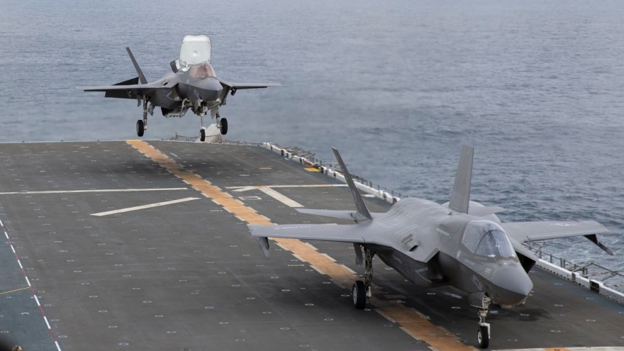 VOV.VN - Các chiến đấu cơ F-35B Lightning II của thủy quân lục chiến Mỹ cùng Phi đội máy bay chiến đấu hàng hải 121 (VMFA-121) đã tiến hành các hoạt động diễn tập trên tàu tấn công đổ bộ USS Tripoli (LHA-7) khi con tàu hiện diện ở khu vực Ấn Độ - Thái Bình Dương.