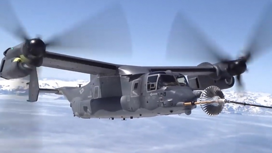 VOV.VN - Clip sau quay cảnh máy bay đa nhiệm CV-22 Osprey đang được tiếp nhiên liệu ở trên không. Việc tiếp nhiên liệu như này (đòi hỏi sự khéo léo) giúp phi cơ mở rộng tầm bay. CV-22 Osprey có khả năng cất hạ cánh theo phương thẳng đứng.