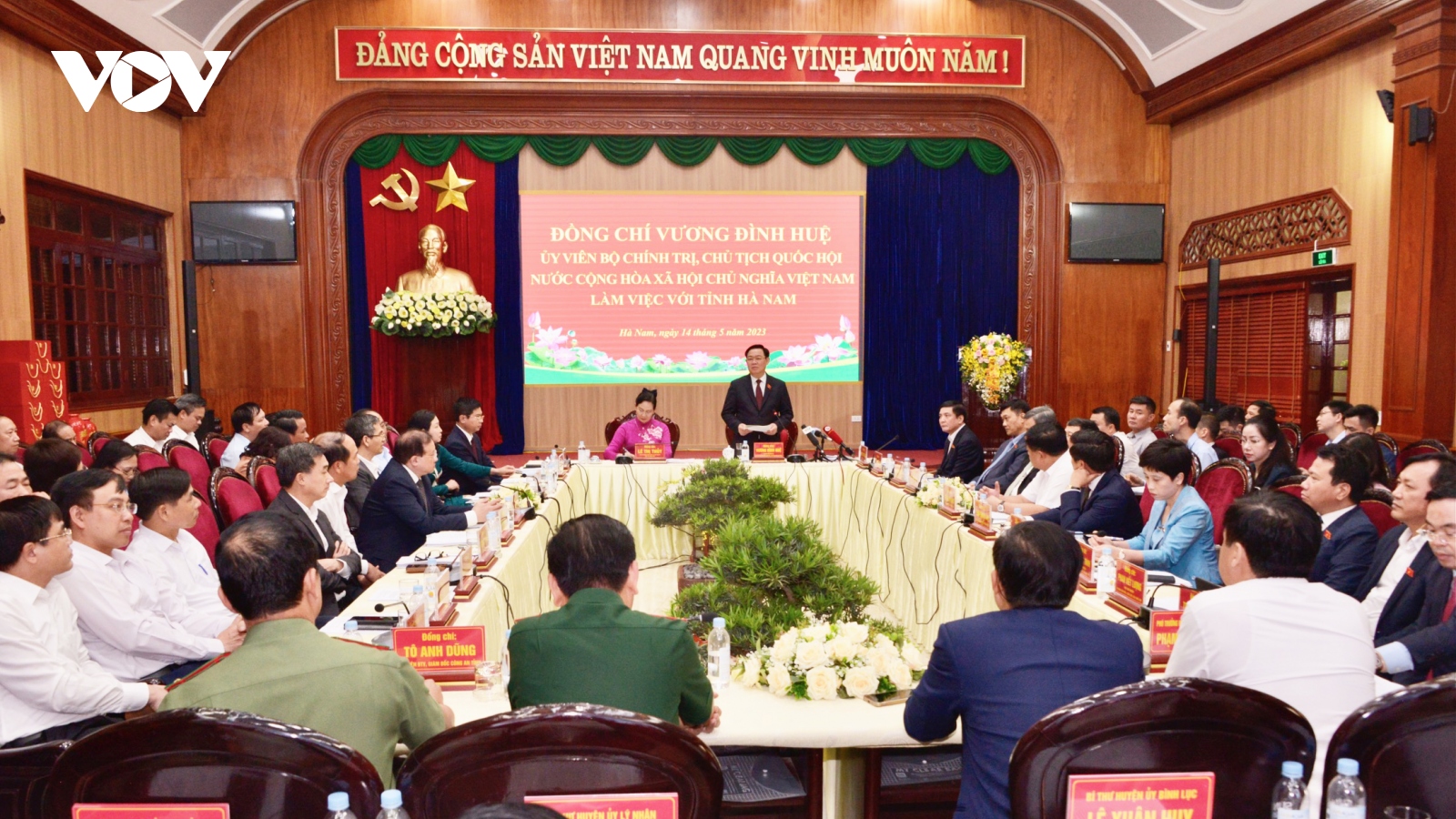 VOV.VN - Chiều 14/5, Chủ tịch Quốc hội Vương Đình Huệ làm việc với Ban Thường vụ Tỉnh ủy Hà Nam về tình hình triển khai Nghị quyết Đại hội XIII của Đảng, Nghị quyết 20 Đại hội Đảng bộ tỉnh cùng kết quả thực hiện nhiệm vụ phát triển kinh tế - xã hội, thu chi ngân sách nhà nước trong 4 tháng đầu năm nay.