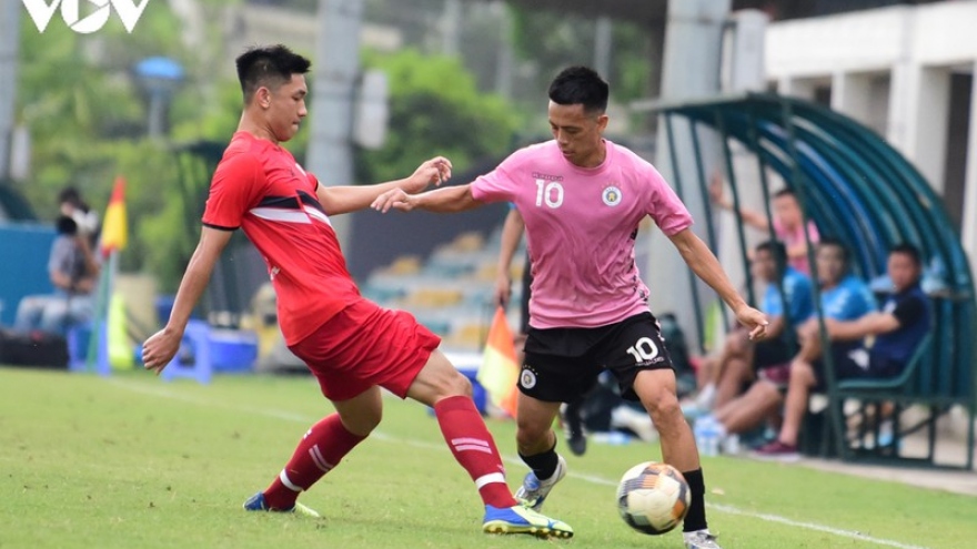 VOV.VN - Trong buổi tập đầu tiên khi trở lại với Hà Nội FC, Văn Hậu tỏ ra rất chăm chú lắng nghe những hướng dẫn của người "đàn anh" kỳ cựu Lê Tấn Tài.