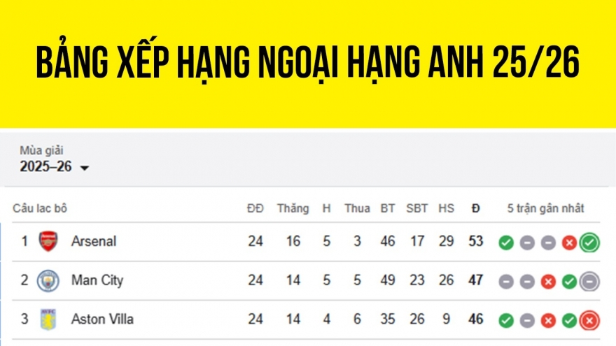 VOV.VN - Bảng xếp hạng Ngoại hạng Anh 2025/2026 mới nhất tính đến sau vòng 24: MU sau chiến thắng cảm xúc trước Fulham hiện đang có 41 điểm và xếp thứ 4.