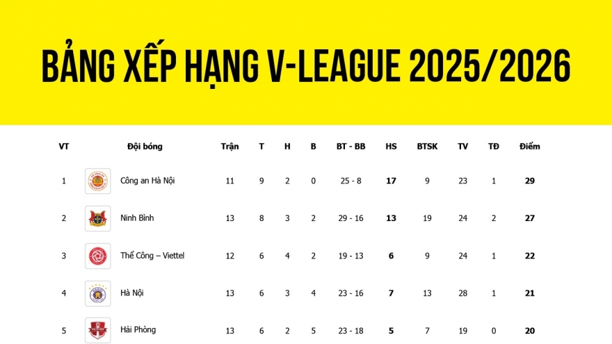 VOV.VN - Cập nhật bảng xếp hạng V-League 2025/2026 mới nhất tính đến sáng 10/2: CLB Nam Định chưa thể bứt phát trên bảng xếp hạng sau khi bất ngờ để Hà Tĩnh cầm hòa ở vòng 13.
