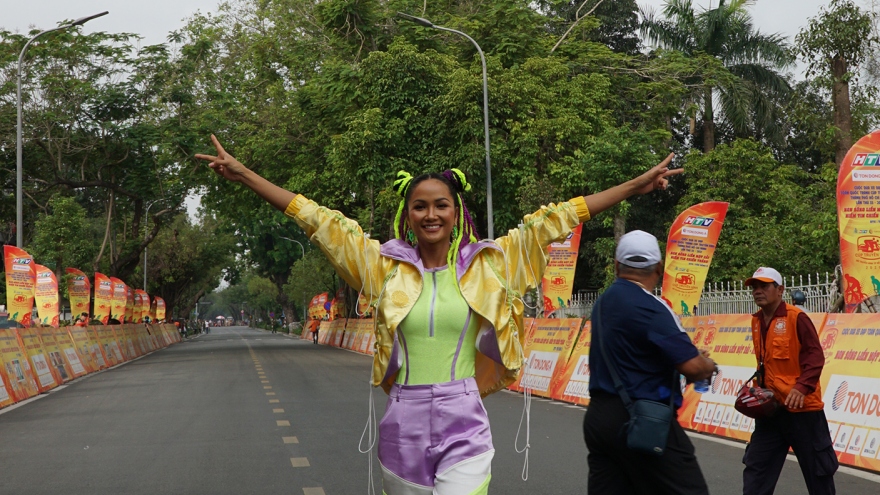 VOV.VN - Đồng hành cùng cuộc đua xe đạp tranh cúp truyền hình HTV 2021 trong chặng ở Huế, Hoa hậu H’Hen Niê tiếp tục tạo ấn tượng với khán giả bằng kiểu tóc tết hai búi, đồ thể thao màu nổi.