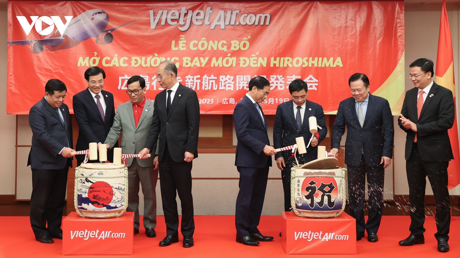 VOV.VN - Hãng hàng không Vietjet hôm nay 20/5 công bố đường bay thẳng đầu tiên từ Việt Nam đến tỉnh Hiroshima (Nhật Bản), đường bay thứ tám của Vietjet kết nối hai nước trước sự chứng kiến của Thủ tướng Việt Nam Phạm Minh Chính và đại diện lãnh đạo cấp cao của Chính phủ Việt Nam, Nhật Bản, và chính quyền tỉnh Hiroshima.