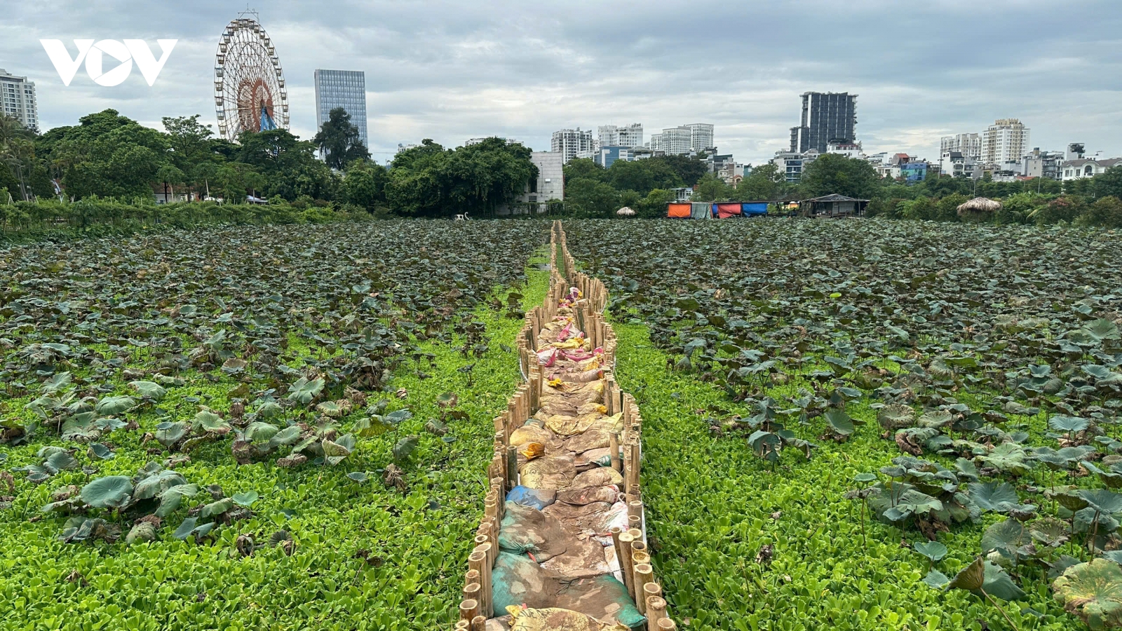 Đóng cọc, dựng bờ, gấp rút cải tạo Hồ Sen thành bể lắng bổ cập nước cho Hồ Tây