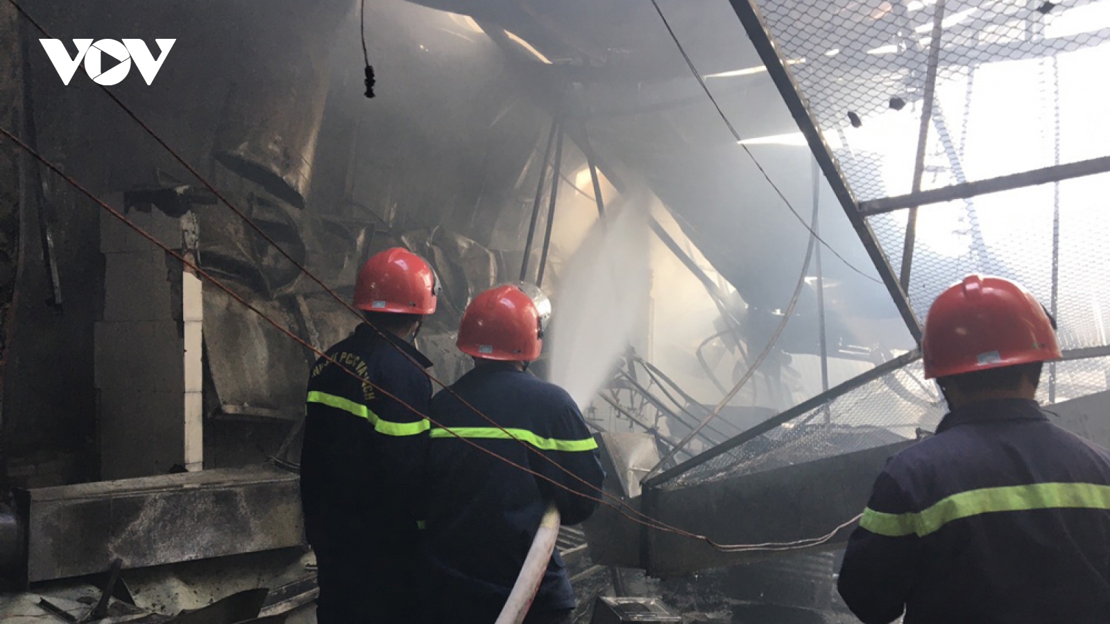 VOV.VN - Sáng nay (18/5), tại thành phố Dĩ An, tỉnh Bình Dương xảy ra vụ cháy tại một công ty chuyên sản xuất sản phẩm từ gỗ. Sau khi đám cháy được dập tắt, lực lượng chữa cháy tiếp tục phun nước không để ngọn lửa bùng phát trở lại.