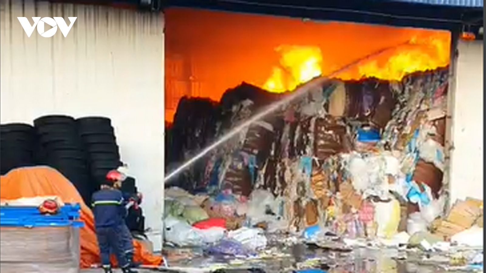VOV.VN - Sáng 22/10, một vụ cháy lớn xảy ra tại Chi nhánh Công ty TNHH TM&DV xử lý môi trường Việt Khải (phường Lái Thiêu, TP Thuận An, Bình Dương) khiến 450m2 nhà kho bị thiêu rụi.