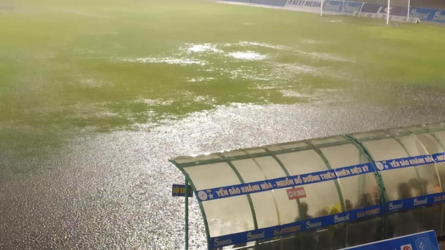 VOV.VN - Cuộc đọ sức ở giải hạng Nhất Quốc gia 2020 giữa Khánh Hòa và An Giang đã phải kết thúc vào buổi sáng ngày 14/10 do điều kiện mưa lớn ở sân Nha Trang khi trận đấu bắt đầu được hơn 20 phút vào chiều 13/10.