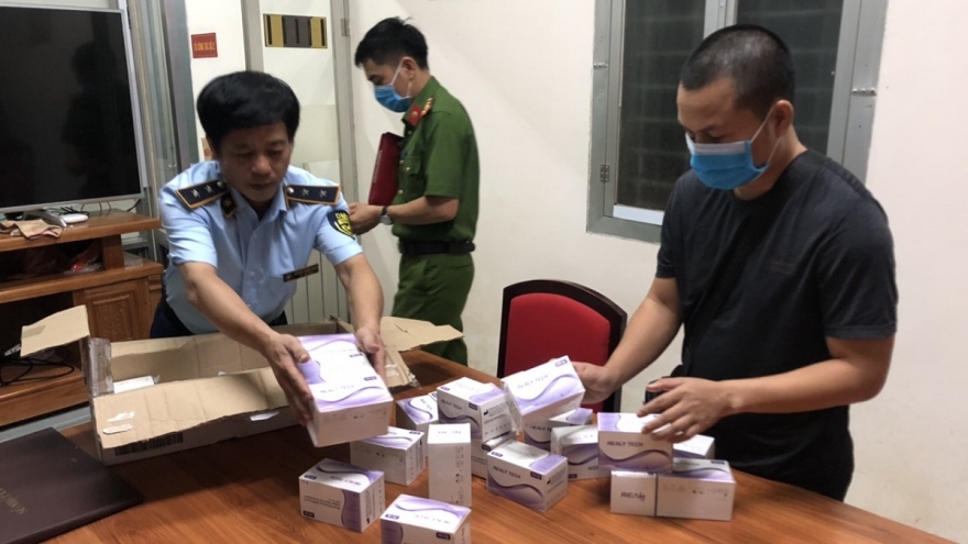 VOV.VN - Công an quận Hoàng Mai (Hà Nội) phối hợp với Đội Quản lý thị trường số 15 vừa phát hiện, thu giữ 117 bộ kit test nhanh Covid-19, nhãn hiệu Realy Tech, do nước ngoài sản xuất, không có hóa đơn chứng từ.