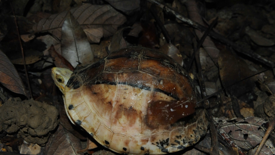 VOV.VN - Ngày 14/1, Ban Quản lý rừng phòng hộ Tây Hòa (Đắk Lắk) cho biết, trong quá trình khảo sát thực địa cùng với Trung tâm Công nghệ và Bảo tồn Thiên nhiên, các chuyên gia đã ghi nhận sự hiện diện của rùa hộp trán vàng miền Nam (Cuora picturata) - loài nguy cấp toàn cầu tại các cánh rừng tự nhiên do đơn vị quản lý.