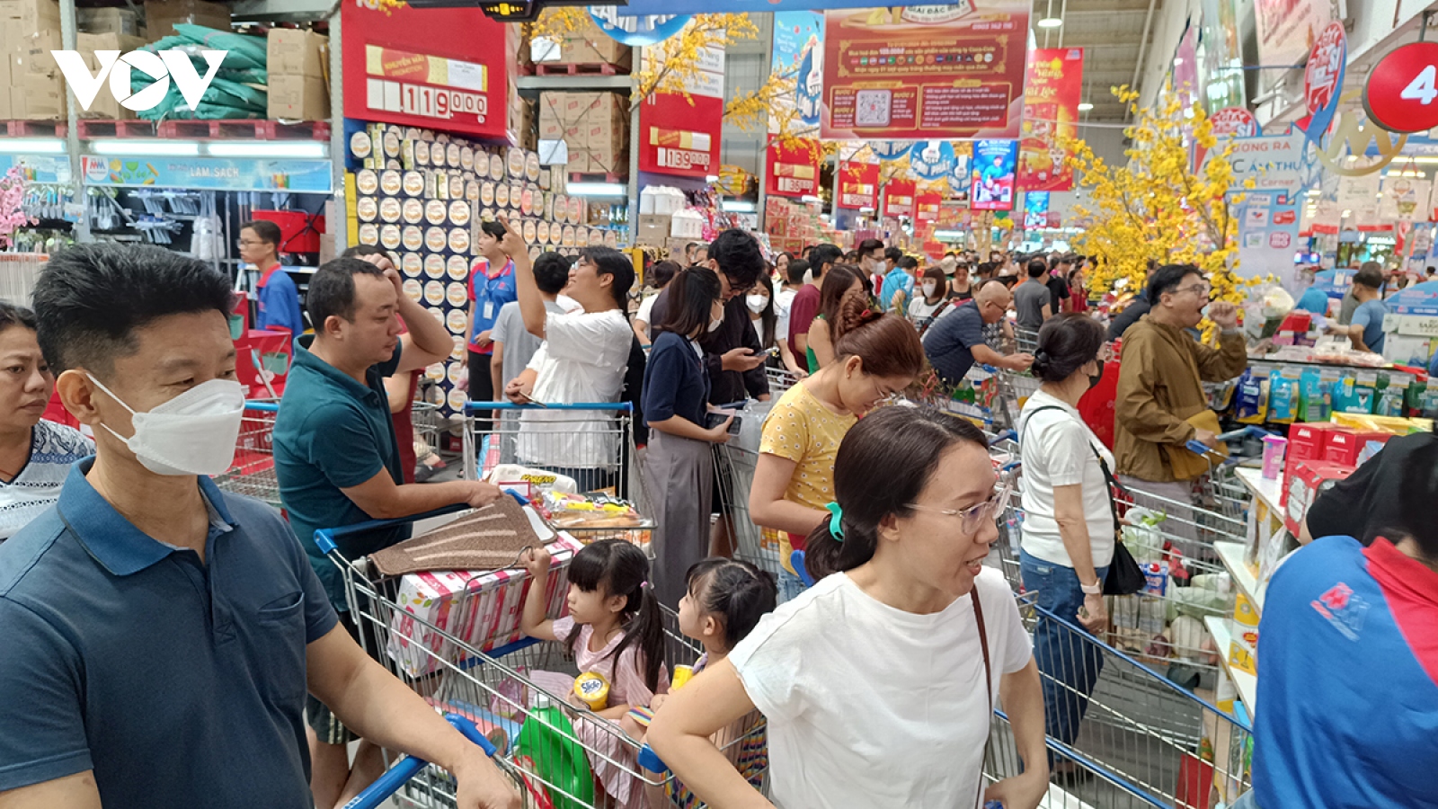 VOV.VN - Hôm nay 29 tháng Chạp năm Quý Mão, người dân TP.HCM đổ xô tới các siêu thị, cửa hàng để mua sắm đồ chuẩn bị đón Tết, các quầy hàng thực phẩm tươi sống, đồ uống, bánh kẹo mứt thu hút đông đảo khách hàng.