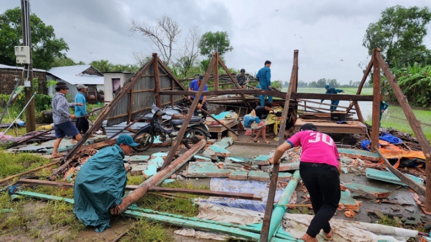 VOV.VN - Do ảnh hưởng của hoàn lưu bão, mưa giông, lốc xoáy đã làm sập và tốc mái nhiều căn nhà của người dân; hàng ngàn ha lúa và hoa màu bị ngã đổ và ngập úng.