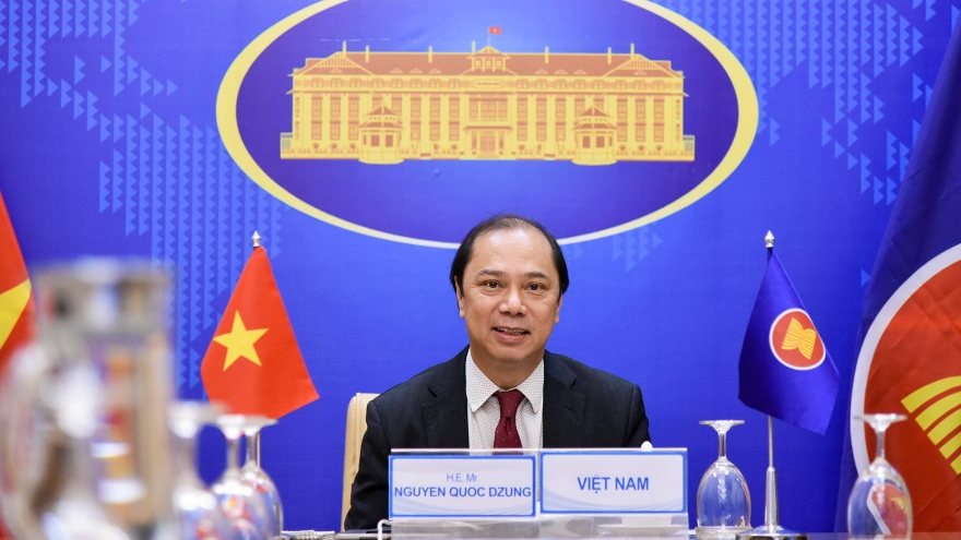 VOV.VN - Tối 24/6, Thứ trưởng Bộ Ngoại giao Nguyễn Quốc Dũng, Trưởng SOM ASEAN Việt Nam, đã tham dự Hội nghị trực tuyến Quan chức cao cấp các nước tham gia cấp cao Đông Á (EAS) gồm các nước ASEA và các đối tác.