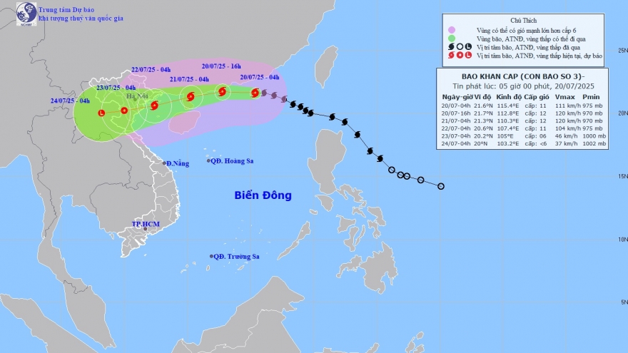 VOV.VN - Hồi 04 giờ ngày 20/7, vị trí tâm bão ở vào khoảng 21,6 độ Vĩ Bắc; 115,4 độ Kinh Đông, trên vùng biển phía Bắc khu vực Bắc Biển Đông, cách Quảng Ninh-Hải Phòng khoảng 830km về phía Đông.