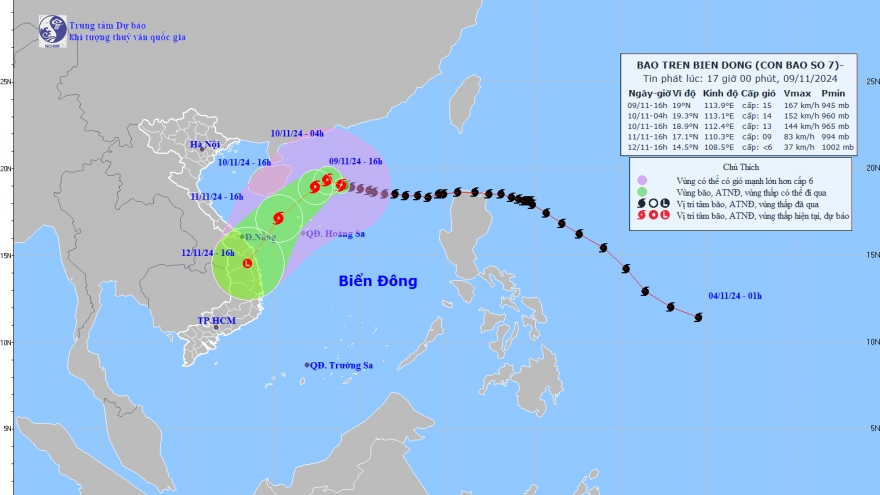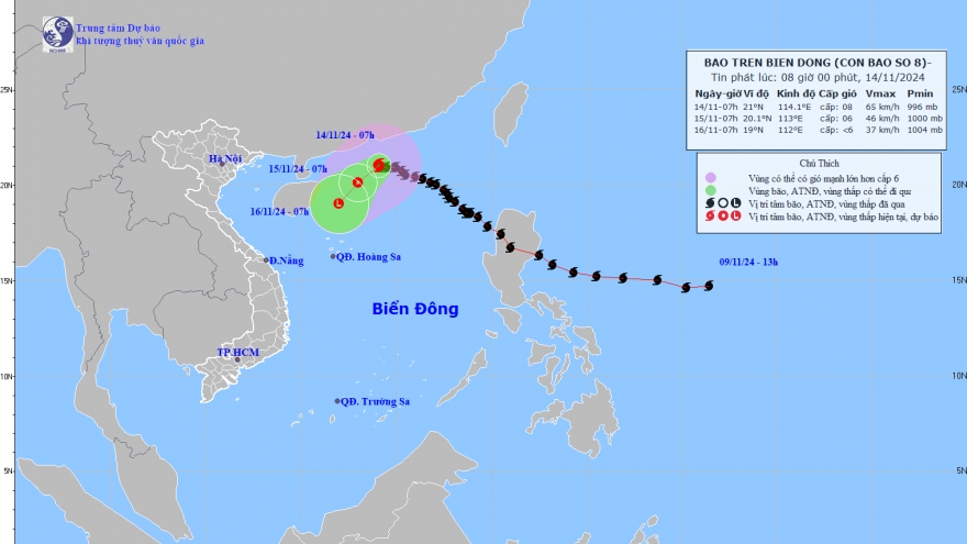 VOV.VN - Vào hồi 7h ngày 14/11 bão số 8 giật cấp 10 và di chuyển theo hướng Tây, tốc độ khoảng 5km/h và đang có xu hướng giảm cường độ trong những giờ tới