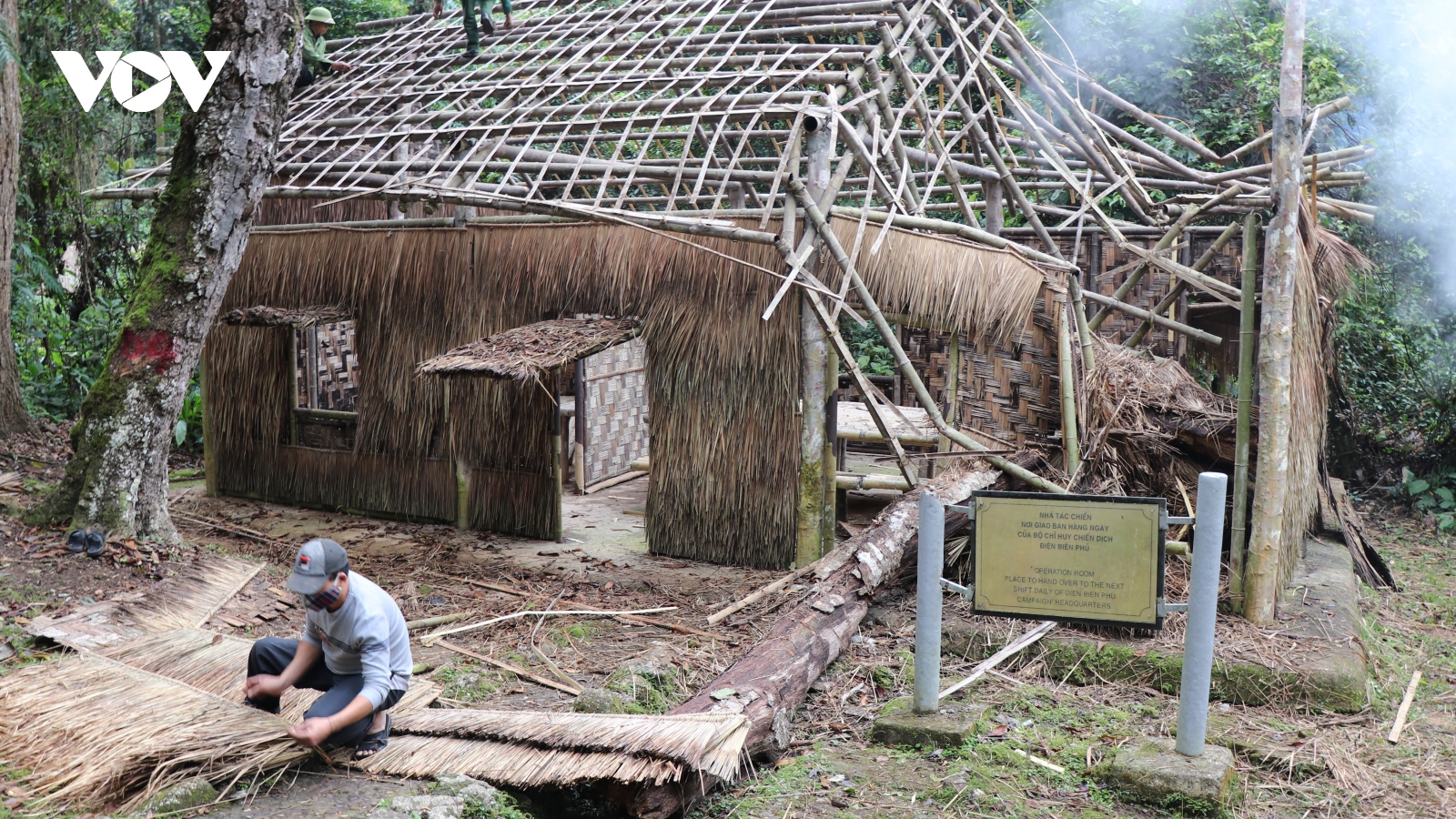 VOV.VN - Các cơ quan chức năng đang khẩn trương khắc phục hư hỏng tại Lán tác chiến (thuộc Di tích Sở Chỉ huy Chiến dịch Điện Biên Phủ) bị cây gẫy đổ làm hư hỏng, sớm đón khách tham quan.