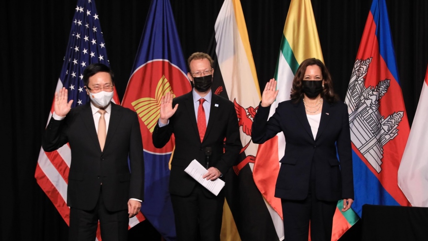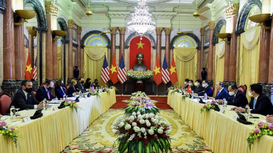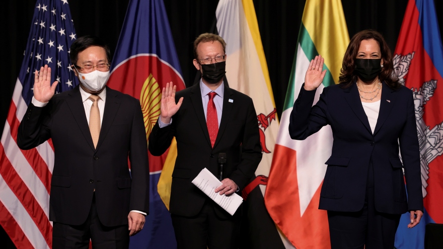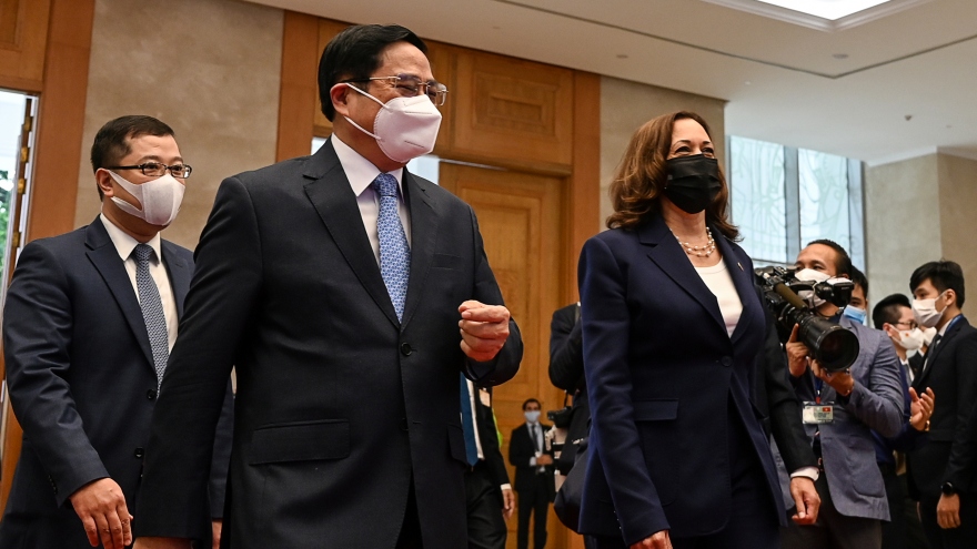 VOV.VN - Bày tỏ tự hào với những bước tiến của Mỹ và Việt Nam, bà Harris cho biết, sau các cuộc gặp với lãnh đạo Việt Nam, Mỹ và Việt Nam đã công bố các thỏa thuận mới nhằm mang lại lợi ích cho người dân, sự thịnh vượng và an ninh cho cả hai quốc gia.