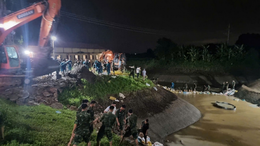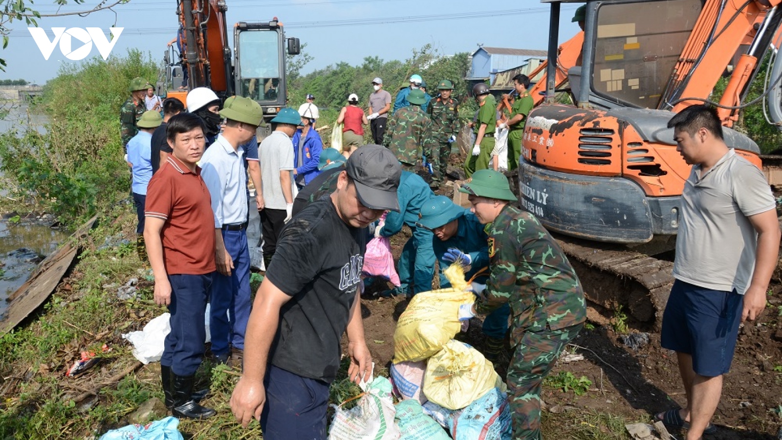 VOV.VN - Hơn 1000 người được huy động để đóng cọc bê tông, cọc tre, thả hộc bê tông, bao tải đất, rọ đá… khắc phục sự cố công trình thủy lợi trên đê sông Ngũ Huyện Khê ở Bắc Ninh.