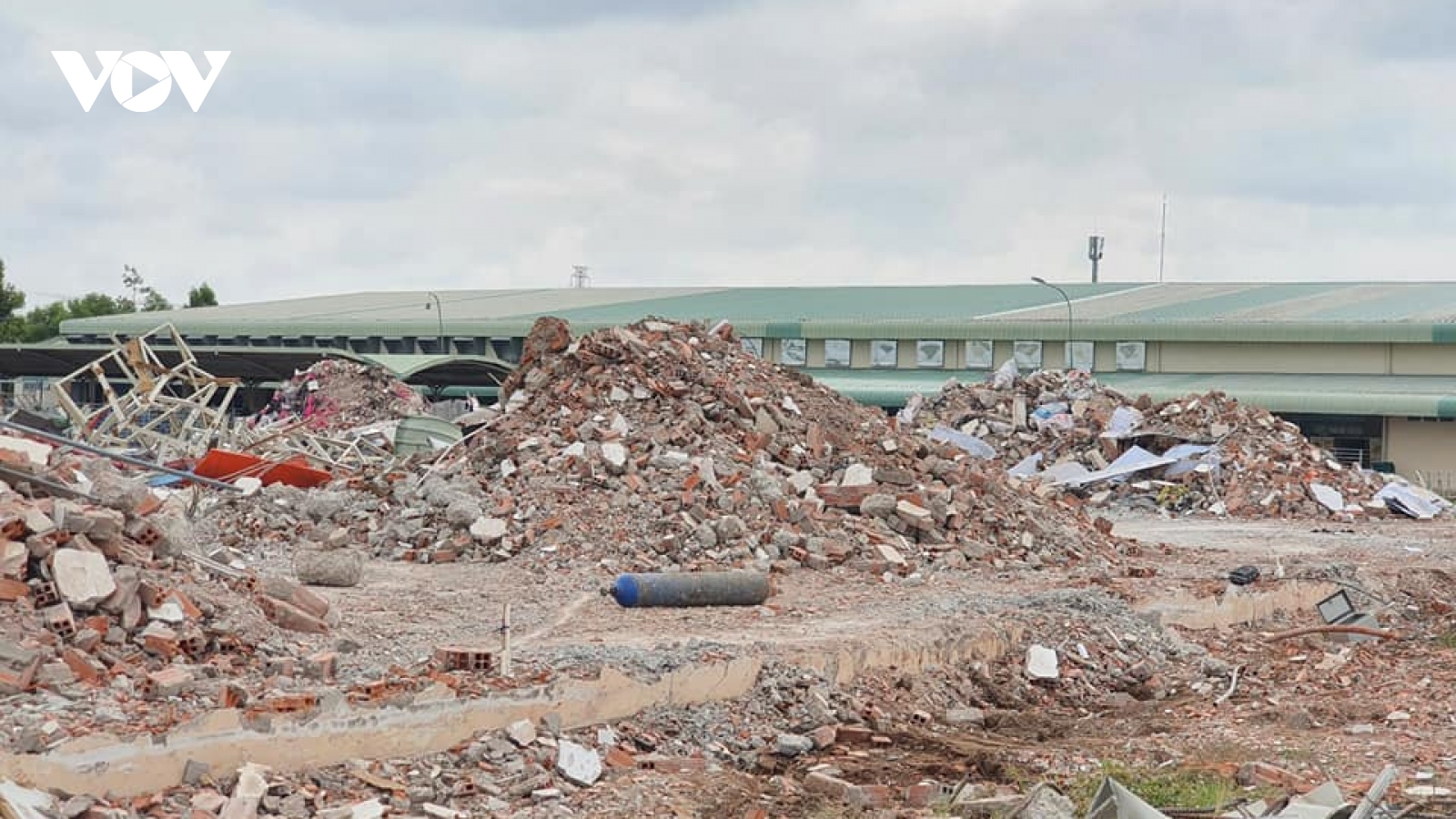 VOV.VN - Sau gần 4 tháng bị gió lốc làm sập nhà xưởng đến nay, một doanh nghiệp ở Khu công nghiệp Tân Hương, tỉnh Tiền Giang vẫn chưa thu dọn hiện trường và xây lại cơ sở sản xuất do phải đóng mức phí vận chuyển ra vào quá cao.