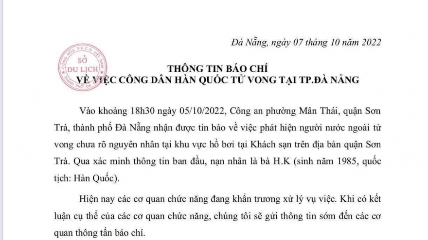 VOV.VN - Chiều 8/10, Sở Du lịch TP. Đà Nẵng thông tin, vụ một nữ du khách Hàn Quốc bị tử vong tại khu vực hồ bơi của một khách sạn trên địa bàn quận Sơn Trà.