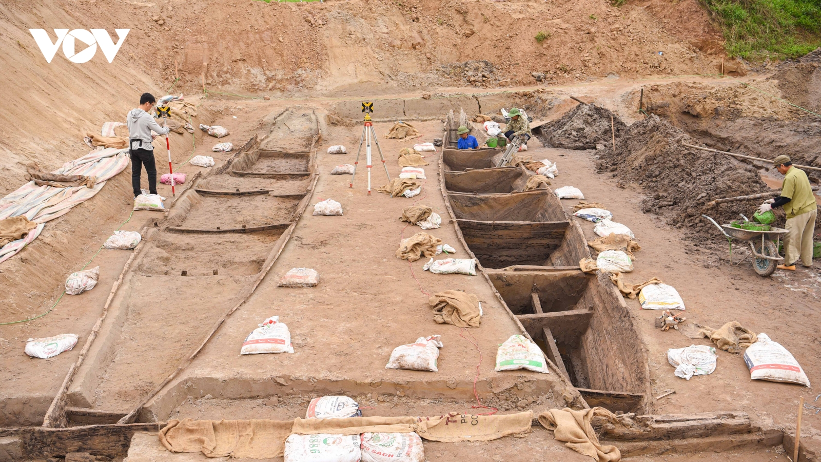 VOV.VN - Sở Văn hóa, Thể thao và Du lịch tỉnh Bắc Ninh đang phối hợp Viện Khảo cổ học tiến hành khai quật 2 chiếc thuyền cổ có chiều dài khoảng 15m, rộng 2,2m và 1 chiếc dài 14m, rộng khoảng 1,6m.