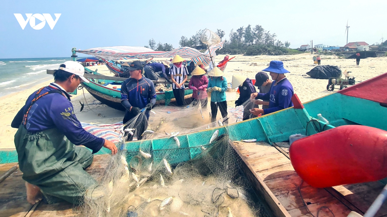 VOV.VN - Chỉ cần ra khơi cách bờ biển vài trăm mét, ngư dân đã trúng luồng cá đù, có chuyến đến hàng tấn, phải dựng lều bạt ở bờ biển huy động người thân cùng gỡ cá rồi nhanh chóng ra khơi.