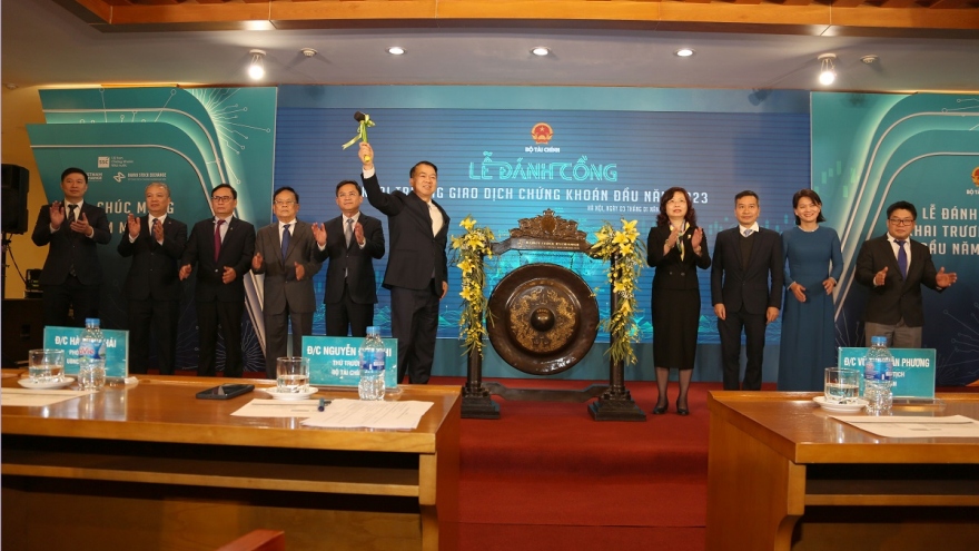 VOV.VN - Sáng nay (3/1), tại Sở Giao dịch Chứng khoán Hà Nội (HNX), Thứ trưởng Bộ Tài chính Nguyễn Đức Chi đánh cồng khai trương giao dịch chứng khoán đầu năm 2023.