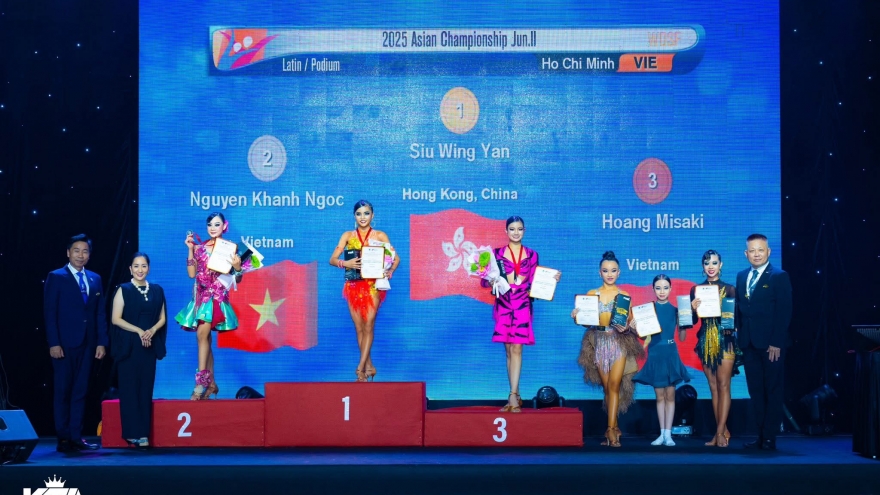 VOV.VN - VĐV 14 tuổi Nguyễn Khánh Ngọc đã lập thành tích xuất sắc: xếp thứ 2/58, giảnh Huy chương Bạc ở Hạng mục Solo dành cho vận động viên trẻ (Junior II Sola Latin) tại giải khiêu vũ thể thao quốc tế Vietnam Dancesport Festival 2025