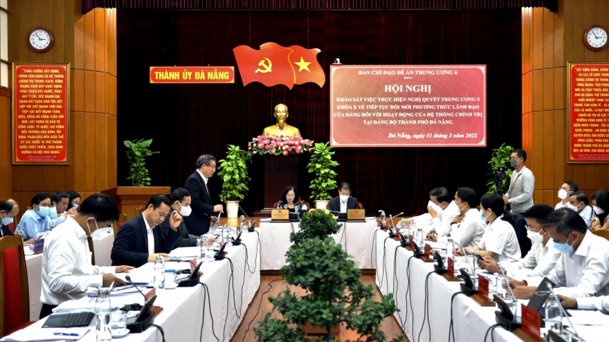 VOV.VN - Chiều nay (23/3), Đoàn khảo sát của Ban Chỉ đạo Đề án Trung ương 6 làm việc với Thành ủy Hải Phòng về việc thực hiện Nghị quyết Trung ương 5 khóa X về tiếp tục đổi mới phương thức lãnh đạo của Đảng đối với hoạt động của hệ thống chính trị tại Đảng bộ thành phố Hải Phòng.