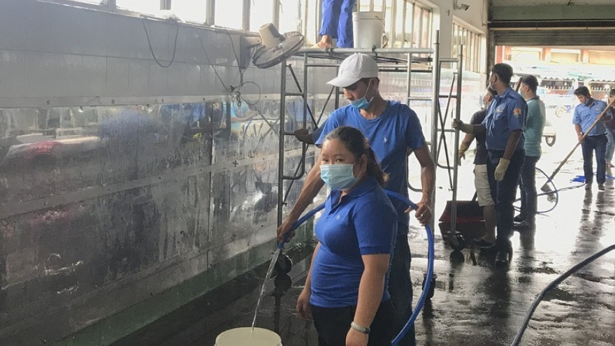 VOV.VN -Ban quản lý chợ đầu mối Hóc Môn thường xuyên vệ sinh, sát trùng khu vực trong chợ, cửa ra vào khu vực bán rau, bán thịt đều gắn chai nước sát trùng.