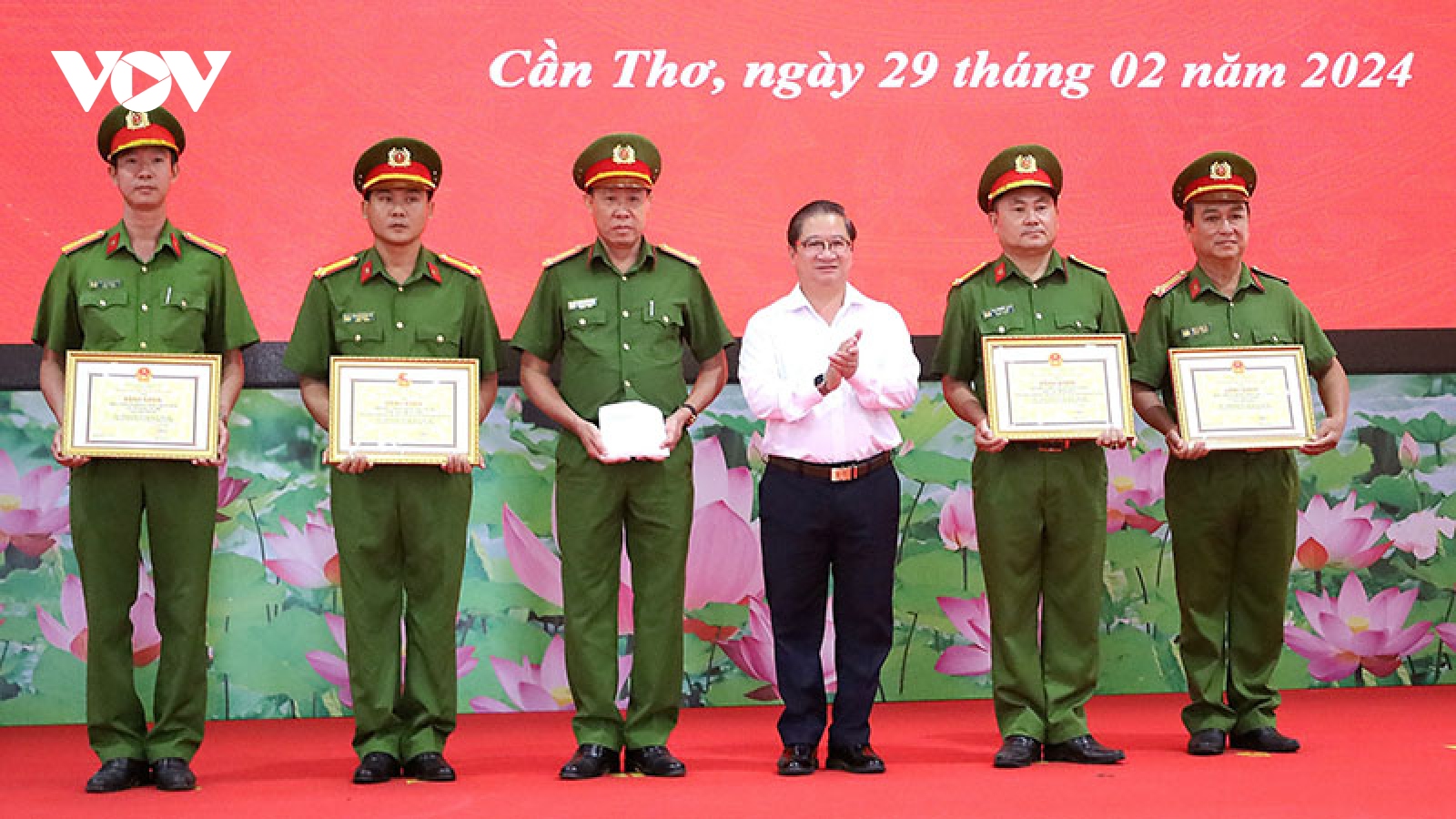VOV.VN - Sáng 29/2, ông Trần Việt Trường – Phó Bí thư Thành ủy, Chủ tịch UBND TP. Cần Thơ đã chủ trì buổi lễ trao khen thưởng cho tập thể, cá nhân lực lượng Công an TP. Cần Thơ vì có thành tích xuất sắc trong công tác kịp thời chữa cháy, cứu nạn, cứu hộ trong vụ cháy garage ô tô.