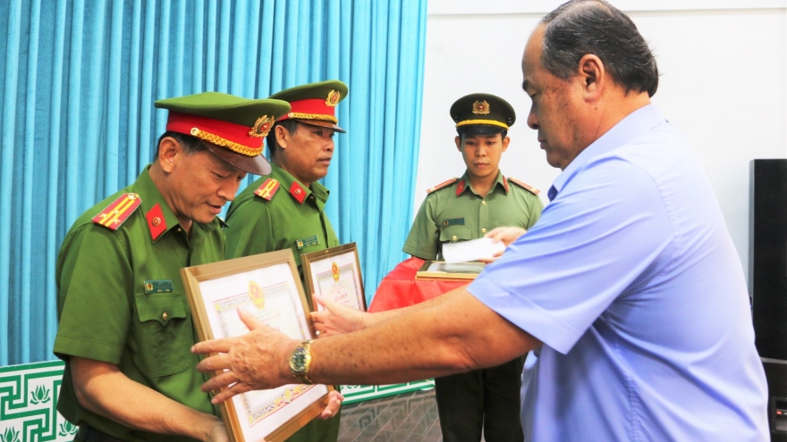 VOV.VN - Chiều nay 17/11, Chủ tịch UBND tỉnh An Giang đã tặng bằng khen và thưởng nóng cho các tập thể có thành tích xuất sắc trong công tác điều tra, truy bắt nhanh các đối tượng trong vụ 2 nhóm đối tượng “thanh toán” nhau, xảy ra ngày 12/11.