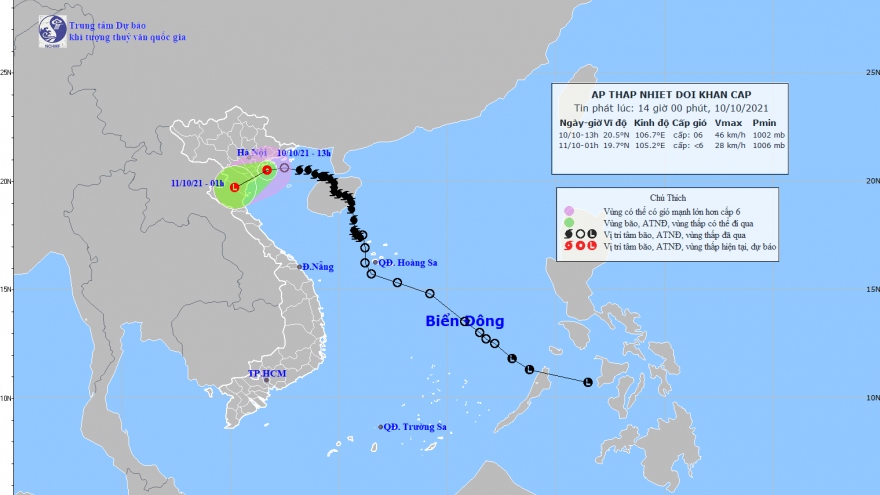VOV.VN - Theo Trung tâm Dự báo khí tượng thủy văn Quốc gia, dự báo trong 12 giờ tới, áp thấp nhiệt đới di chuyển chủ yếu theo hướng Tây Nam, mỗi giờ đi được khoảng 15km, suy yếu thành một vùng áp thấp và đi vào khu vực từ Hải Phòng đến Thanh Hóa.