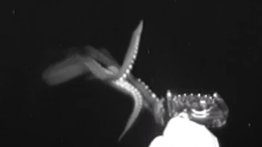 VOV.VN - Mực khổng lồ là loài sinh vật rất khó tiếp cận vì chúng sống ở dưới đáy biển sâu, cần phải có những thiết bị chuyên dụng để ghi hình. Trong đoạn video, con mực lao vào mồi nhử rất nhanh, giơ xúc tu và quấn chặt lấy mồi nhử.