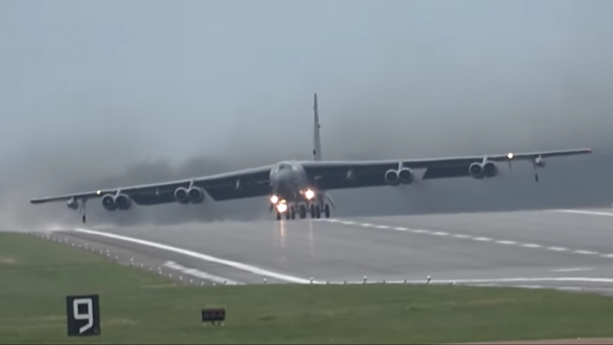 VOV.VN - Do ảnh hưởng của gió mạnh, chiếc máy bay B-52 của không quân Mỹ có vẻ chao đảo và nghiêng vài độ so với hướng bay chuẩn khi sắp cất cánh trên đường băng RAF Fairford ở Anh.