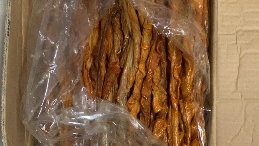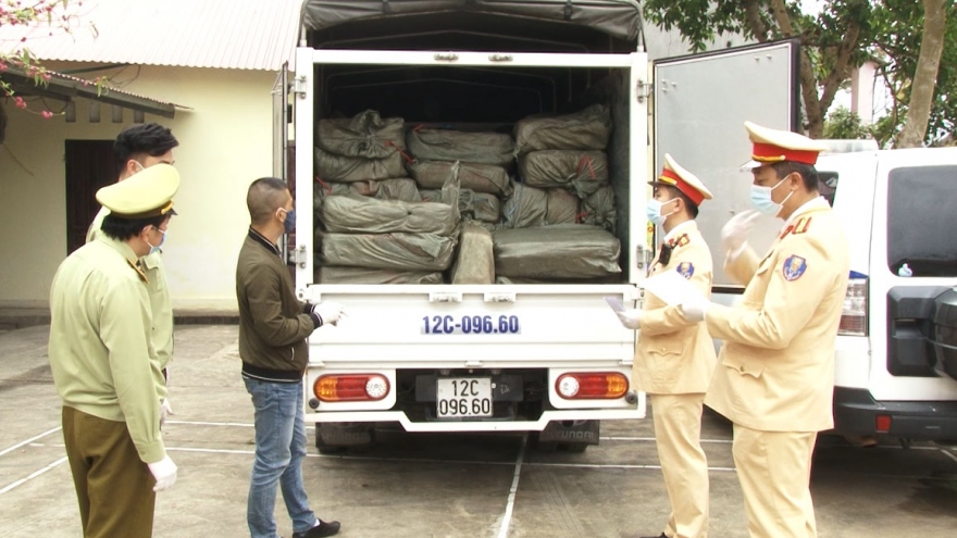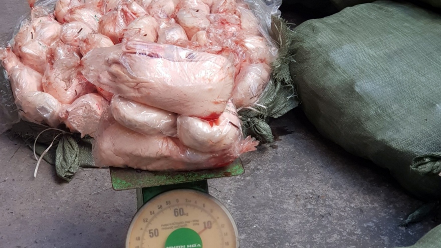 VOV.VN - Tiến hành kiểm tra tại chỗ, lực lượng chức năng phát hiện trên xe đang vận chuyển 100 bao tải dứa, có chứa nầm lợn đông lạnh, bị chảy nước và có hiện tượng chuyển màu.