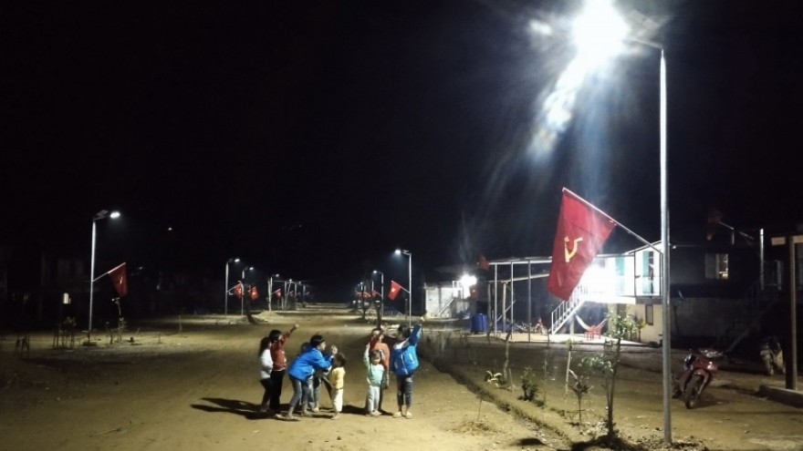 VOV.VN - Những ngày này, bản Sắt ở xã biên giới Trường Sơn (huyện Quảng Ninh, tỉnh Quảng Bình sáng bừng ánh điện từ nhà ra ngõ, dọc các con đường. Sau khi khu tái định cư hoàn thành, Bộ đội Biên phòng tỉnh Quảng Bình đã hỗ trợ nơi đây thực hiện mô hình “Ánh sáng vùng biên”.