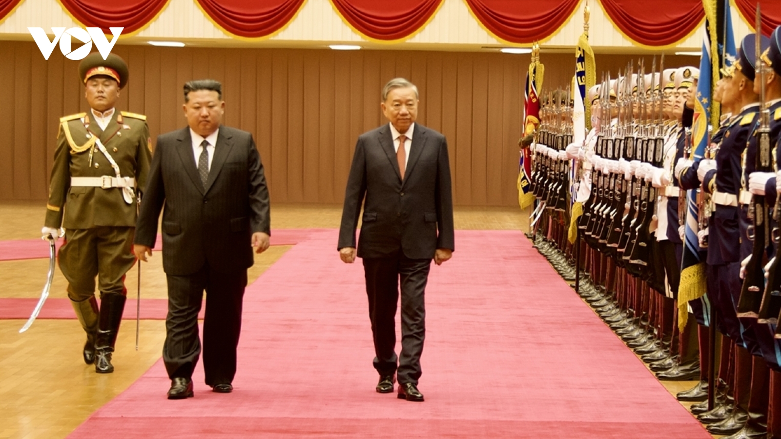 VOV.VN - Sáng 9/10 (theo giờ địa phương ) tại Cung Thể thao ở Thủ đô Bình Nhưỡng, Tổng Bí thư Đảng Lao động Triều Tiên, Chủ tịch Quốc vụ nước CHDCND Triều Tiên Kim Jong Un chủ trì lễ đón trọng thể Tổng Bí thư Tô Lâm và Đoàn đại biểu cấp cao nước ta sang thăm cấp Nhà nước tới Triều Tiên.